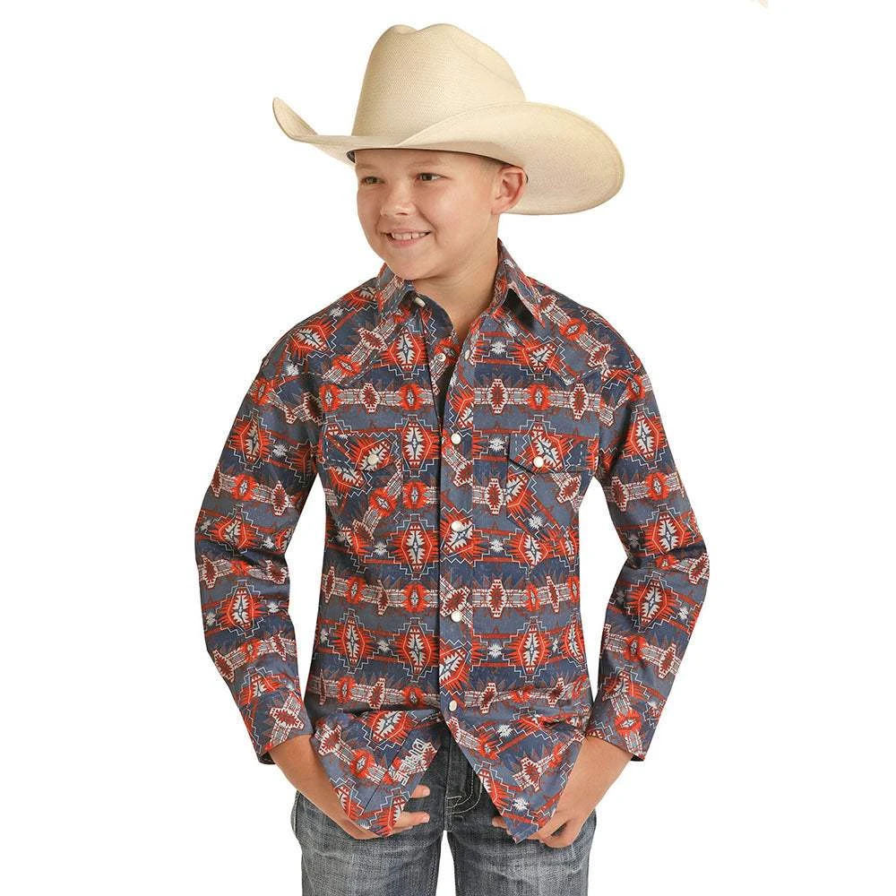 Dress your little cowboy in style in our long sleeve boys aztec hirt from Rock N Roll cowboy!