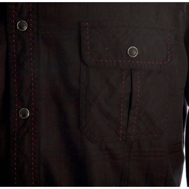 This shirt by Rock N Roll Cowboy� is solid black with red contrast stitching on the seams. It is a snap front shirt with two snap flap front pockets and two snap cuffs on the sleeves. The micro check trim on the inside is a feature that is not noticeable from the outside. The collar is a spread collar lay and featured by western yokes on both the front and the back of the shirt. This 100% cotton shirt is comfortable and looks great with the triple topstitching. Rock & Roll Cowboy is made by