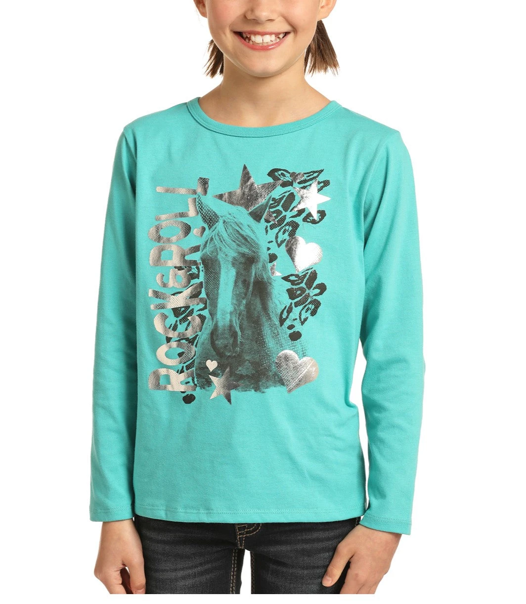 Rock & Roll Cowgirl Girls Horse Graphic Long Sleeve Teal T-Shirt G4T3315
